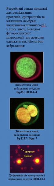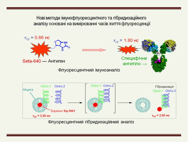 Розроблено серії нових флуоресцентних барвників, чутливих до мікрооточення середовища, у тому числі, до змін pH, гідрофобності, полярності та наявності протеїнів. Такі барвники є перспективними флуоресцентними біоаналітичними реагентами, зондами та мітчиками з поліпшеними експлуатаційними характеристиками для клінічної діагностики, медико-біологічних та фармакологічних досліджень. Із застосуванням цих барвників створено модельний імунофлуоресцентний та гібридизаційний методи аналізу, що основані на вимірюванні часів життя флуоресценції.