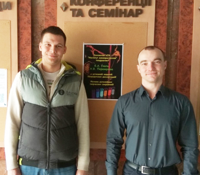 У п'ятницю 03 березня відбувся захист двох кандидатських дисертацій на здобуття наукового ступеня кандидата фізико-математичних наук за спеціальністю 01.04.05 – оптика, лазерна фізика молодших наукових співробітників Інституту сцинтиляційних матеріалів: Гнапа Б.А. і Переверзєва М.В.