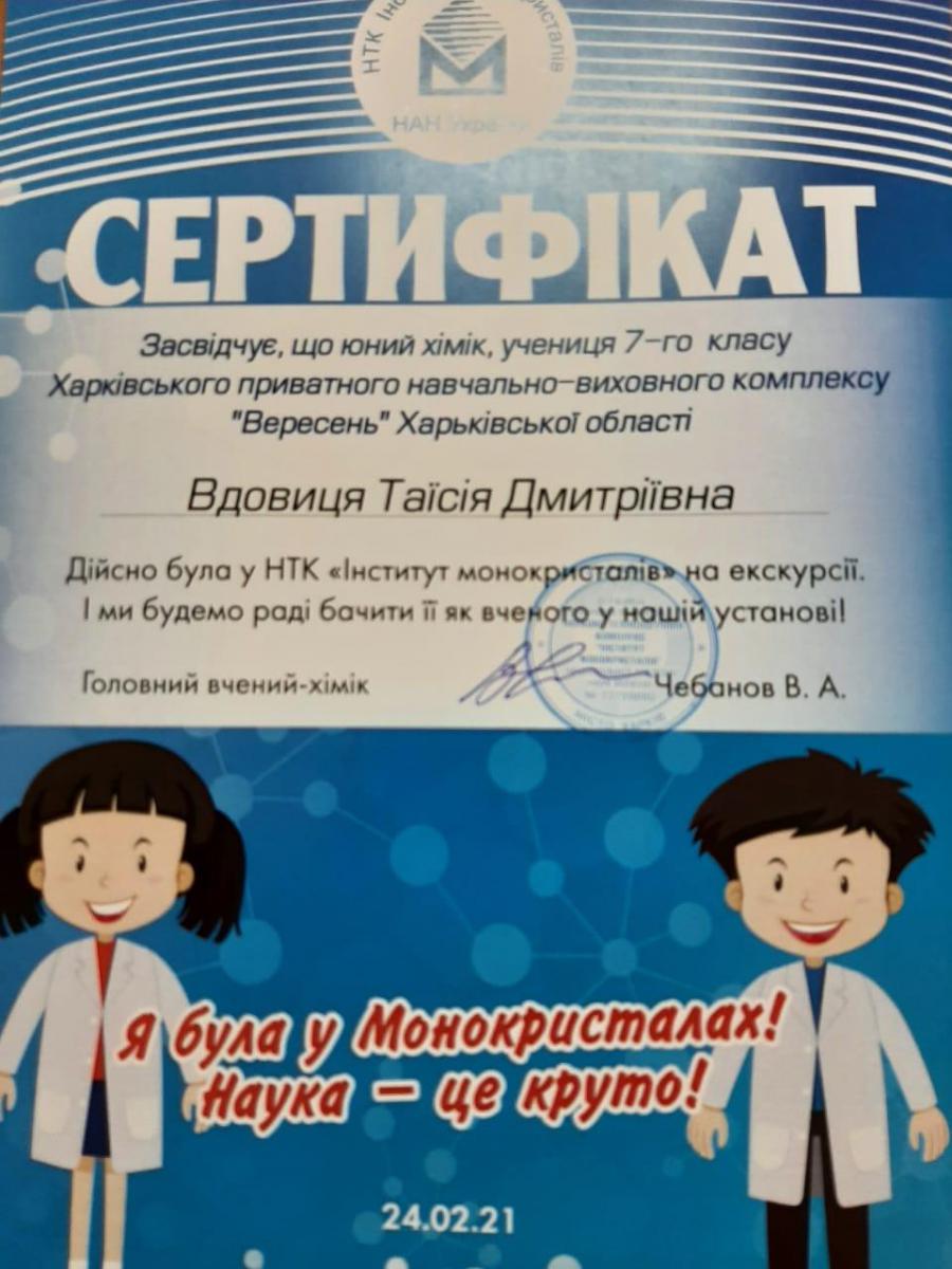 Всі діти отримали сертифікати, які їм вручив заступник генерального директора, член-кореспондент НАН України, професор Валентин Чебанов. На його думку такі екскурсії – це шанс для школярів ближче пізнати специфіку роботи науковців, отримати багато корисної інформації з першоджерел, поспілкуватися зі справжніми знавцями своєї справи та уявити себе в майбутньому.