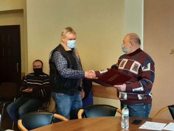 Директор ІСМА академік НАН України Борис Гриньов нагородив старшого наукового співробітника д. ф.-м.н. Олега Тарасенка Почесною грамотою НАН України.