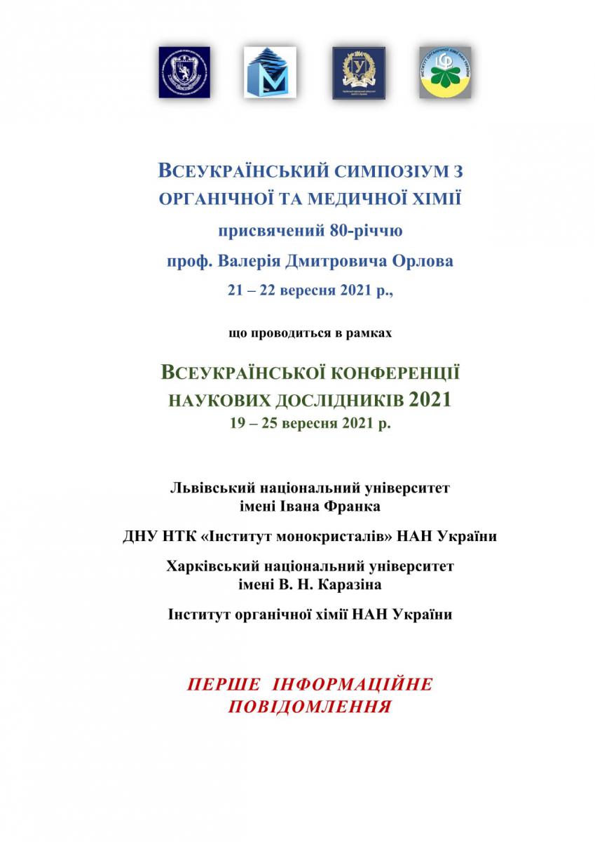 Організаційний комітет з радістю запрошує Вас до участі у Всеукраїнському симпозіумі з органічної та медичної хімії, присвяченому 80-річчю проф. Валерія Дмитровича Орлова, що проводиться в рамках Всеукраїнської конференції наукових дослідників 2021.