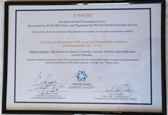 З 3 по 7 червня у місті Капарика (Португалія) проходила 5 Міжнародна Конференція "Хромогенні та емісійні матеріали" (5th International Caparica Conference on Chromogenic and Emissive Materials) - один з важливіших заходів 22 року у галузі барвників і флуоресцентних матеріалів. Вчені відділу люмінесцентних матеріалів та барвників НТК "Інститут монокристалів" НАН України представили усні та постерні доповіді. Молодший науковий співробітник, аспірант (науковий керівник - завідувач відділу, к.х.н., с.д. Анатолій Татарець) Дмитро Кобзев отримав відзнаку Оргкомітету Конференції за кращу постерну доповідь.
