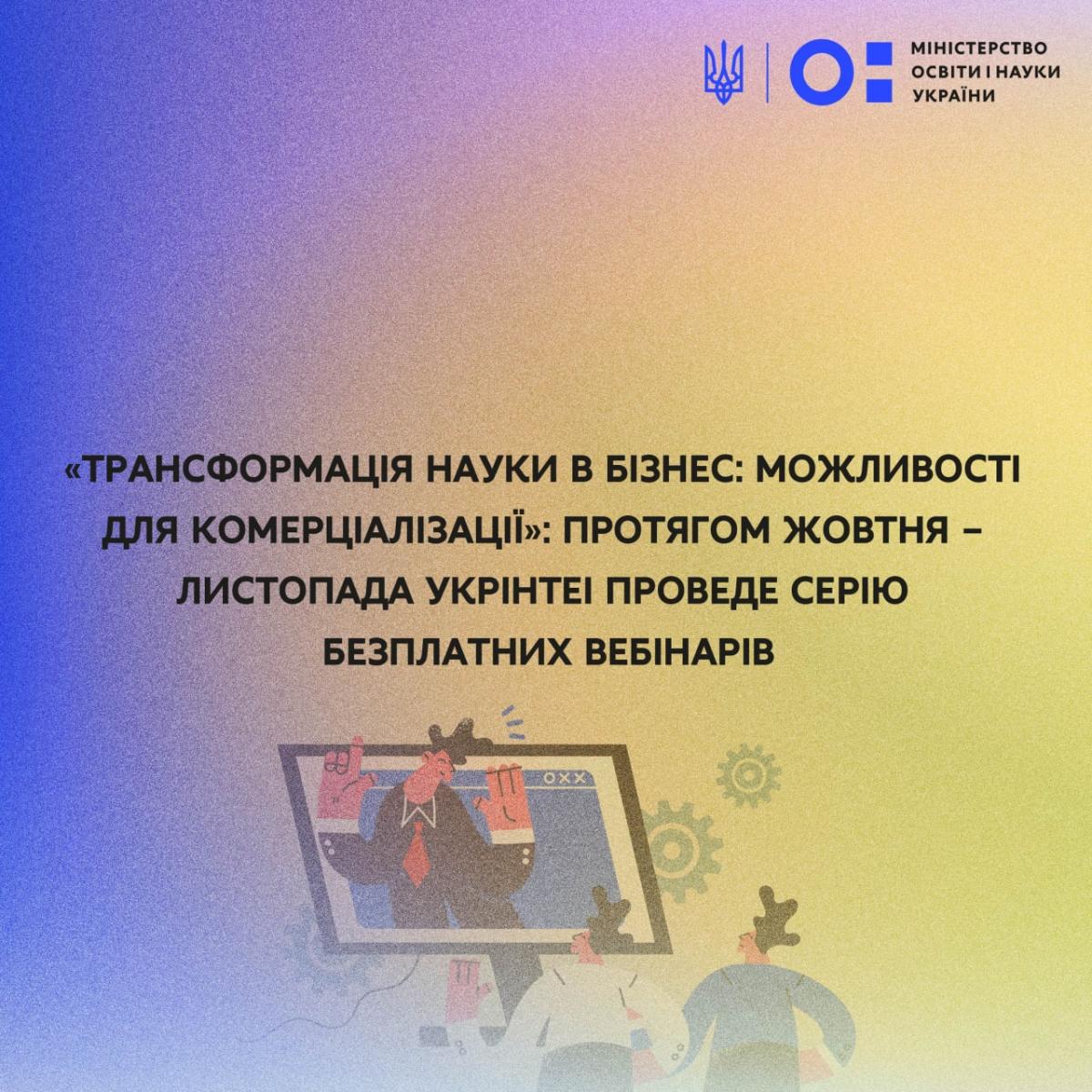 З 4 жовтня до 8 листопада 2022 року Державна наукова установа «Український інститут науково-технічної експертизи та інформації» проведе низку безоплатних вебінарів, у ході яких висвітлюватимуться актуальні питання трансферу технологій та комерціалізації результатів наукових досліджень.