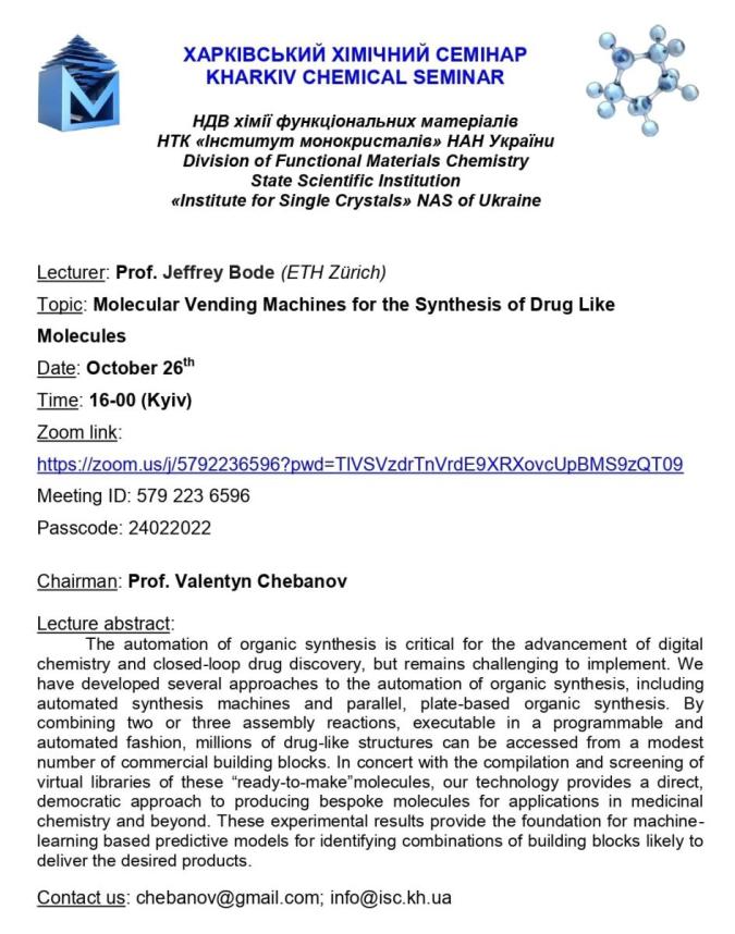 Сьогодні 26 жовтня 2022 року Харківський хімічний семінар (Kharkiv Chemical Seminar), започаткований Науково-дослідним відділенням хімії функціональних матеріалів Науково-технологічного комплексу (НТК) «Інститут монокристалів» НАН України, запрошує на лекцію професора Джефрі Боде (Prof. Jeffrey Bode) з Федеральної вищої технічної школи Цюриха (ETH Zürich, Швейцарія).
