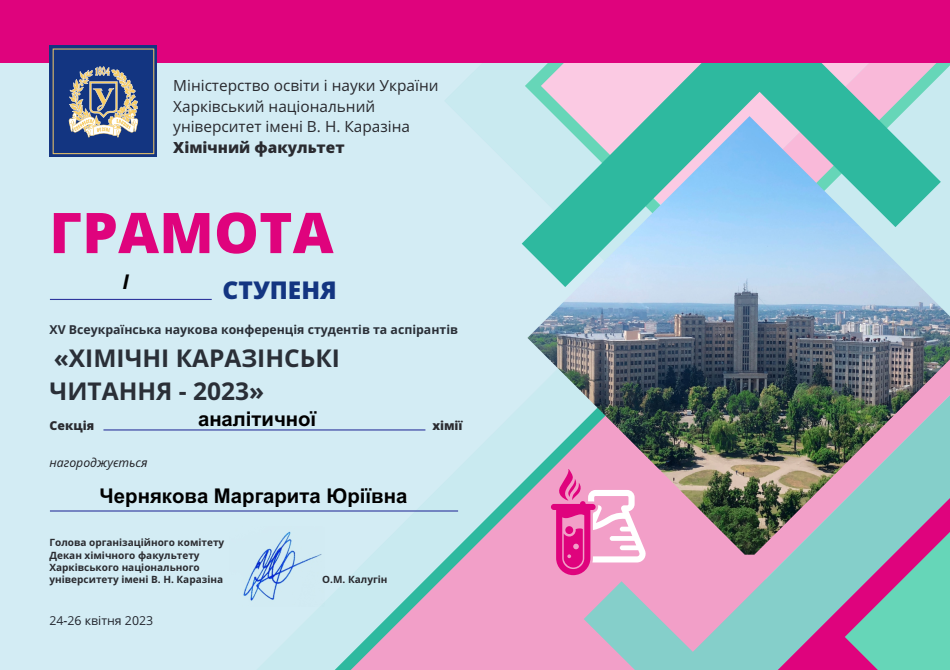 Вітаємо Маргариту Чернякову з перемогою у Хімічних Каразінських читаннях – 2023