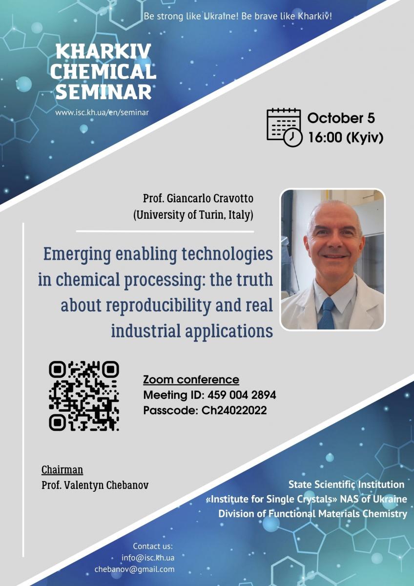 Лектор: Проф. Жанкарло Кравотто (Prof. Giancarlo Cravotto), італійський хімік, інженер, професор органічної хімії та віце-директор факультету фармацевтичних наук і технологій у Туринському університеті. Результати його дослідницької діяльності у галузі зеленої хімії, новітніх технологій та