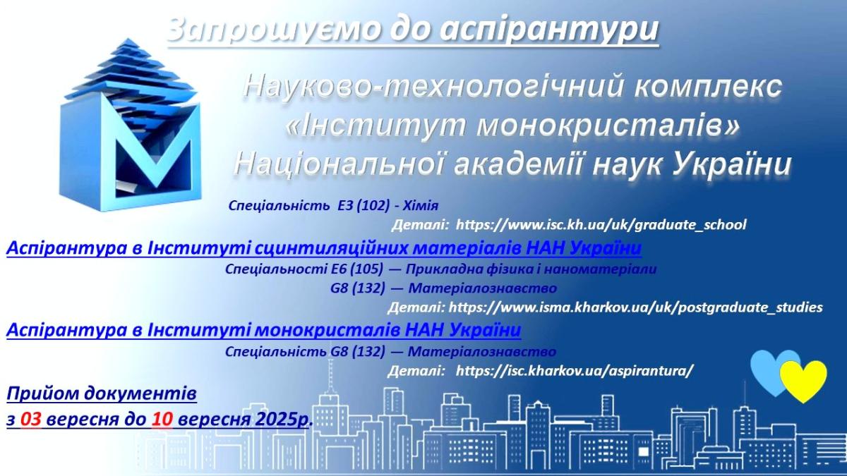 Науково-технологічний комплекс «Інститут монокристалів» НАН України оголошує набір до аспірантури за науковими спеціальностями: