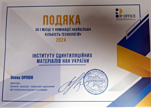 До Дня винахідника і раціоналізатора 2025 року наші колеги з Інституту сцинтиляційних матеріалів НАН України були нагороджені Подякою від Українського національного офісу інтелектуальної власності та інновацій за І місце у номінації «Найбільша кількість технологій» за підсумками 2024 року.