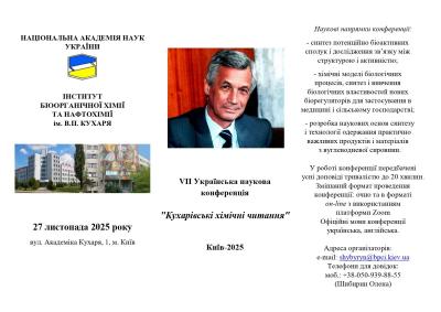 27 листопада 2025 року в Інституті біоорганічної хімії та нафтохімії ім. В.П. Кухаря НАН України (м. Київ, вул. Академіка Кухаря, 1) відбудеться VII Українська наукова конференція «Кухарівські хімічні читання».