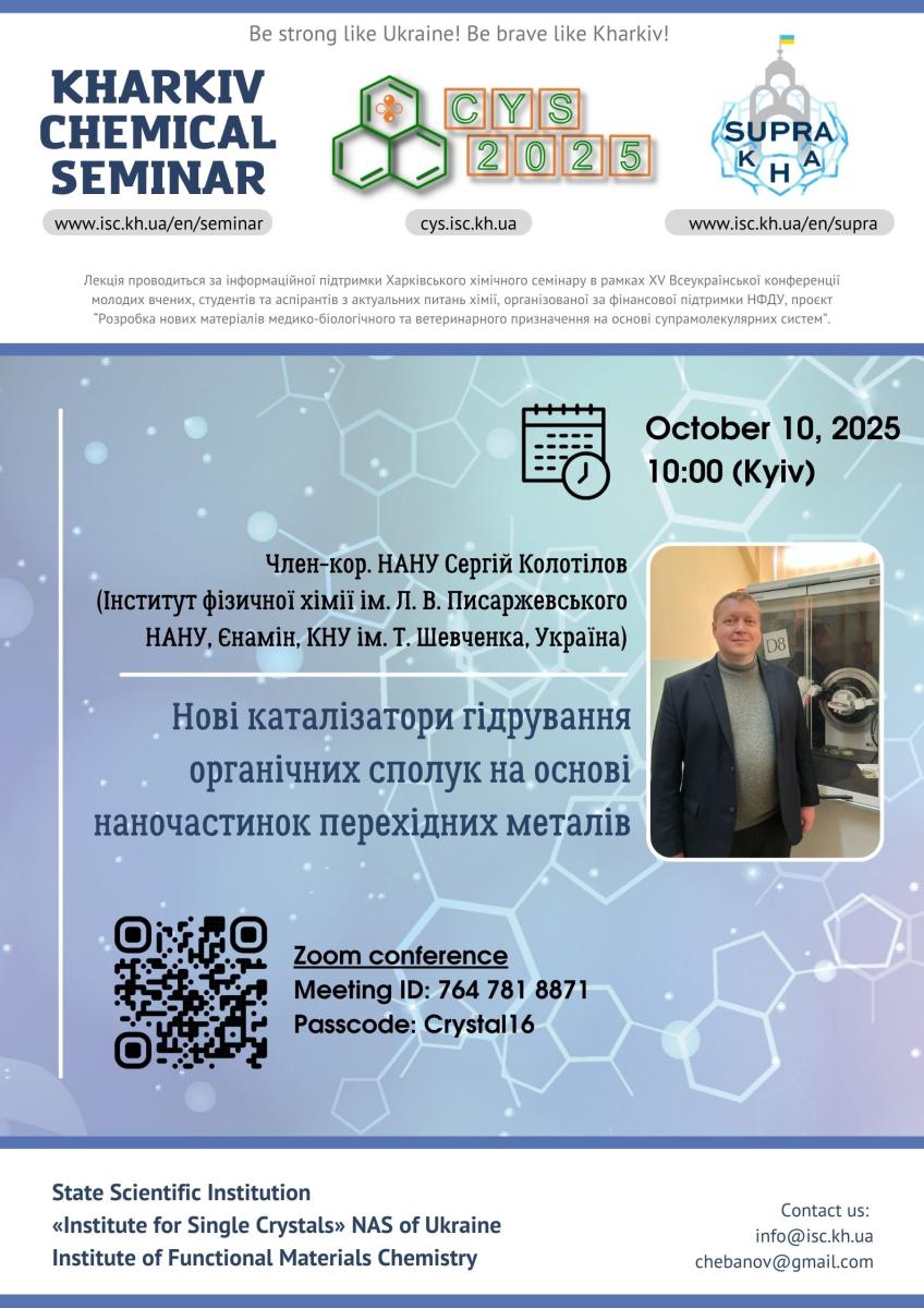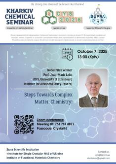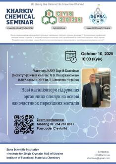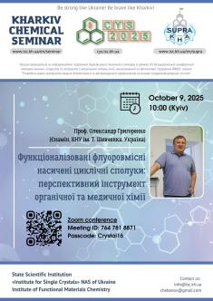 Харківський хімічний семінар (Kharkiv Chemical Seminar), започаткований Інститутом хімії функціональних матеріалів Науково-технологічного комплексу «Інститут монокристалів» НАН України запрошує на серію пленарних лекцій провідних вчених в рамках XV Всеукраїнської конференції молодих вчених, студентів та аспірантів з актуальних питань хімії (https://cys.isc.kh.ua). Конференція відбудеться за фінансової підтримки Національного фонду досліджень України (проєкт SupraKha, https://www.isc.kh.ua/uk/supra).