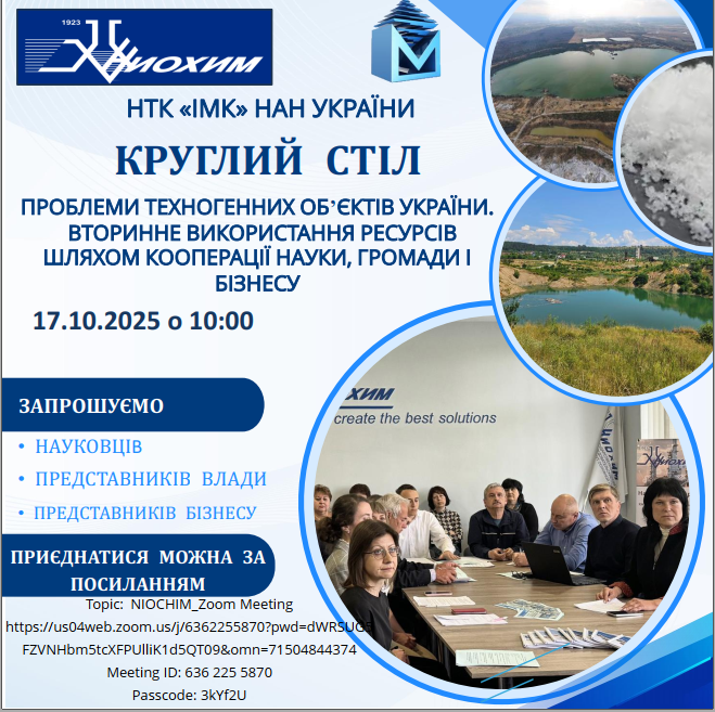17 жовтня 2025 року о 10:00 «Державний науково-дослідний і проектний інститут основної хімії» НТК "Інститут монокристалів" НАН України (Niochim) запрошує на круглий стіл «Проблеми техногенних об'єктів України. Вторинне використання ресурсів через кооперацію науки, громади і бізнесу». Захід відбудеться у змішаному форматі.