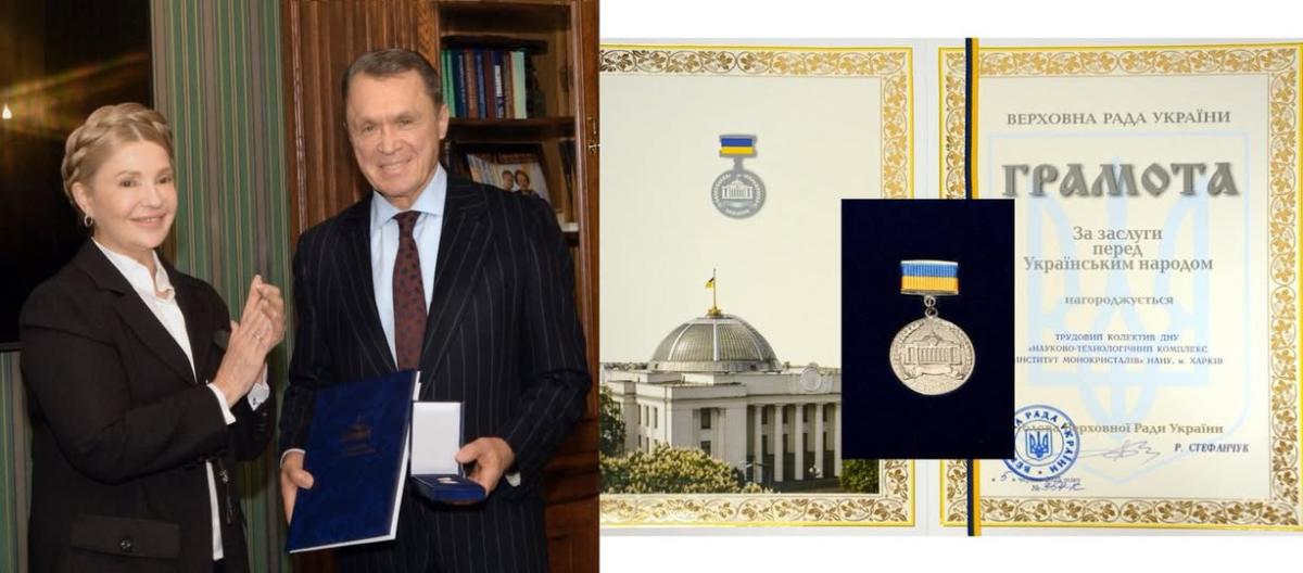 Колектив Науково-технологічного комплексу «Інститут монокристалів» НАН України отримав почесну відзнаку Верховної Ради України — Грамоту «За заслуги перед народом України».