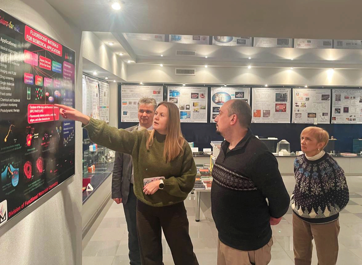 Перший заступник генерального директора НТК, директор ІХФМ, академік НАН України Валентин Чебанов, який очолює Координаційну раду Кластеру, разом із секретарем Ради — заступницею директора ІХФМ, кандидаткою хімічних наук Олесею Кулик ознайомили гостя з виставкою наукових досягнень НТК, новітнім обладнанням і сучасними лабораторіями ІХФМ.