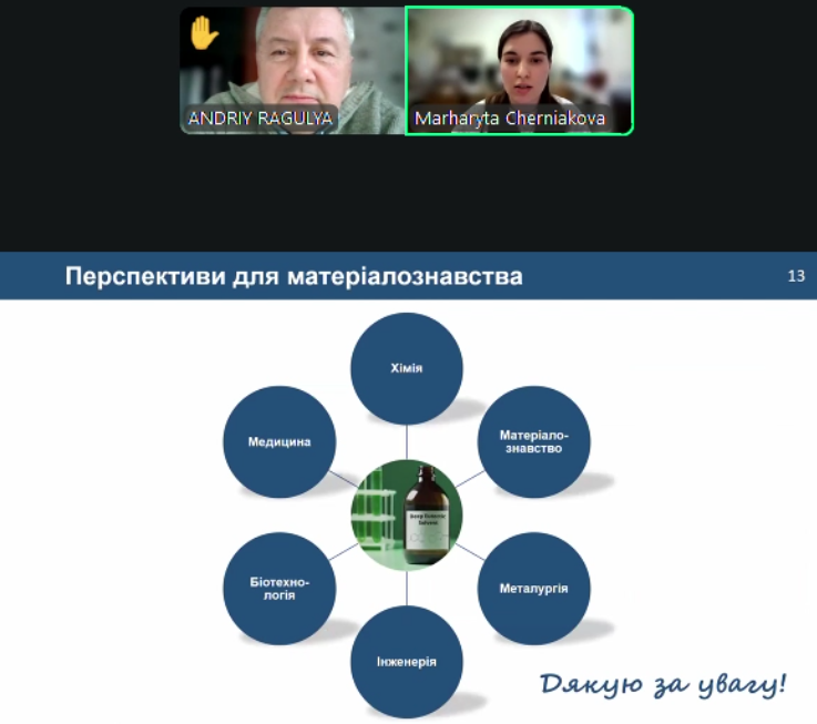 Тема її виступу — «Глибокоевтектичні розчинники: перспектива для хімічного матеріалознавства» — викликала жвавий інтерес серед учасників засідання. У своїй доповіді Маргарита Чернякова представила результати сучасних досліджень екстракційних систем на основі глибокоевтектичних розчинників. Вона детально зупинилася на особливостях фазової рівноваги та міжмолекулярної структури таких систем, запропонувала підходи до їх функціоналізації та продемонструвала високу ефективність цих рішень у вилученні іонів перехідних металів, зокрема токсичних.