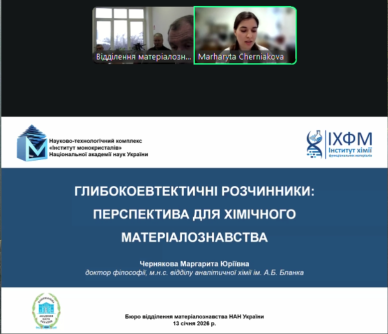 13 січня 2026 року відбулося засідання Бюро Відділення матеріалознавства Національної академії наук України, на якому з науковою доповіддю виступила молода науковиця Інституту хімії функціональних матеріалів НТК, докторка філософії Маргарита Чернякова.