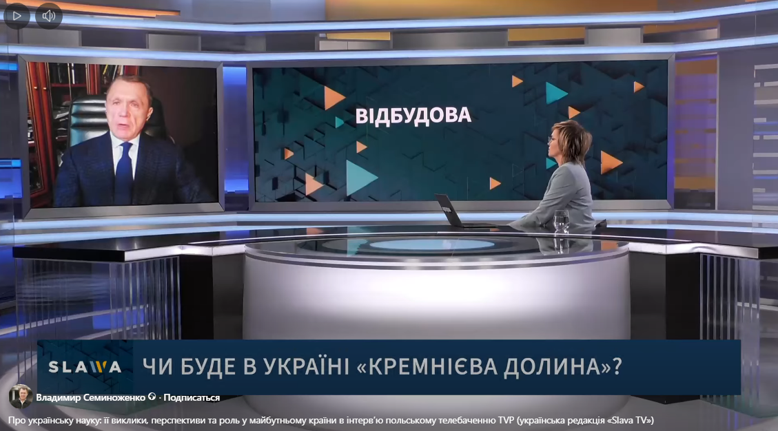 Генеральний директор нашого Комплексу, віцепрезидент Національної академії наук України академік НАН України Володимир Семиноженко в інтерв'ю польському телебаченню TVP (українська редакція «Slava TV») розповів про українську науку: її виклики, перспективи та роль у майбутньому країни.