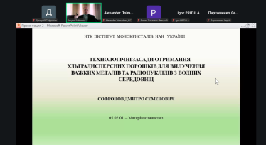 Учора, 29 січня, відбувся успішний захист дисертаційної роботи нашого колеги з інституту монокристалів НАНУ Дмитра Софронова "ТЕХНОЛОГІЧНІ ЗАСАДИ ОТРИМАННЯ УЛЬТРАДИСПЕРСНИХ ПОРОШКІВ ДЛЯ ВИЛУЧЕННЯ ВАЖКИХ МЕТАЛІВ ТА РАДІОНУКЛІДІВ З ВОДНИХ СЕРЕДОВИЩ" на здобуття наукового ступеня доктора технічних наук за спеціальністю 05.02.01 "Матеріалознавство".