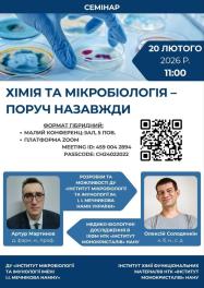У п'ятницю, 20 лютого 2026 р., об 11:00 год. Інститут хімії функціональних матеріалів НТК «Інститут монокристалів» НАНУ та ДУ «Інституту мікробіології та імунології імені І.І. Мечнікова НАМНУ» запрошують усіх зацікавлених на спільний науковий семінар "Хімія та мікробіологія – поруч назавжди". Захід проходитиме у гібридному форматі.