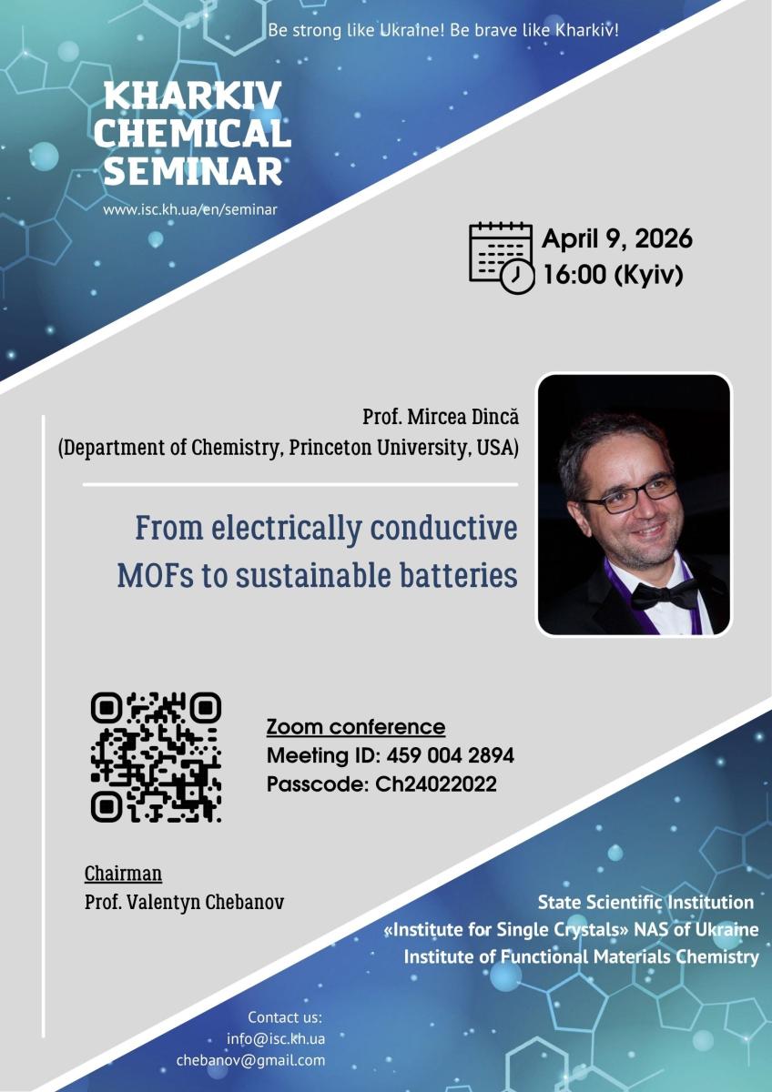Харківський хімічний семінар (Kharkiv Chemical Seminar), започаткований Інститутом хімії функціональних матеріалів НТК «Інститут монокристалів» НАН України запрошує усіх зацікавлених до спілкування та наукових дискусій на черговій лекції, яка відбудеться 9 квітня 2026 року о 16-00 (Київ). Захід проходитиме онлайн на платформі Zoom.